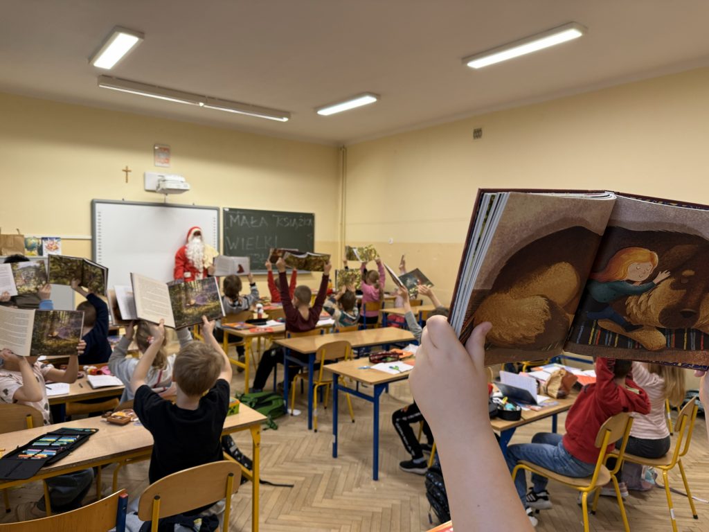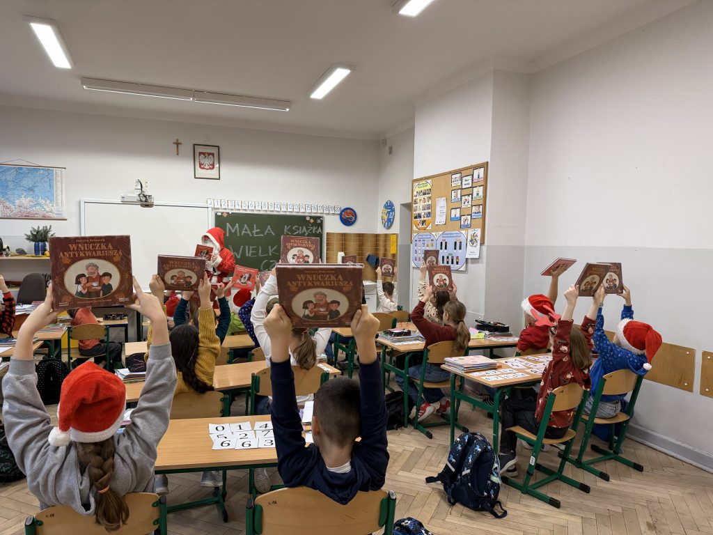 Książka to najlepszy prezent, dlatego nasi pierwszoklasiści w ramach projektu „Mała książka – wielki człowiek” w mikołajki otrzymali książkę Justyny Bednarek Wnuczka antykwariusza.